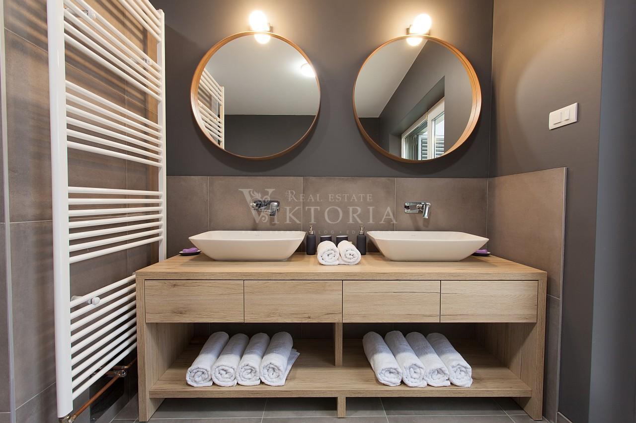 Na prizemnoj etaži nalazi se ulazni hodnik, komforni dnevni boravak, kuhinja i blagovaonica u open space konceptu, wellness prostor sa saunom i kupaonicom, tehnička prostorija, spremište s praonicom i velika spavaća soba. Jedna od ključnih karakteristika prizemlja i dnevnog boravka su zasigurno staklene površine koje pružaju fantastičan pogled na eksterijer i unose dio vanjske prirode u zatvoreni prostor. Iz dnevnog dijela i wellness prostora izlazi se na okućnicu i vanjske sadržaje, na natkrivenu terasu, sunčalište, jacuzzi, grijani bazen 42m2 i vanjsku kuhinju s kaminom. Na katu su smještene tri spavaće sobe, dvije kupaonice i prostrana terasa. Kuća pruža smještaj za 11 ljudi ( 8+3 – ova tri su kreveti na galerijama dimenzije 90×200 u svakoj spavaćoj sobi na katu po jedan ). Unutrašnjost podruma sastoji se od 70m2 površine koju budući vlasnik može opremiti po vlastitim željama i potrebama.