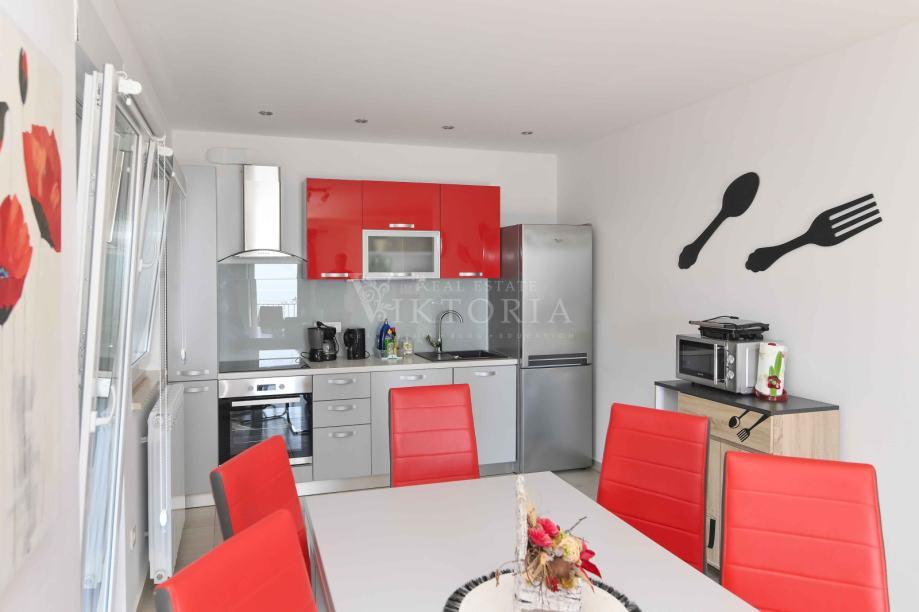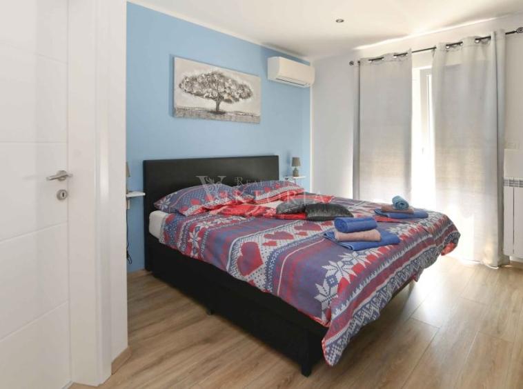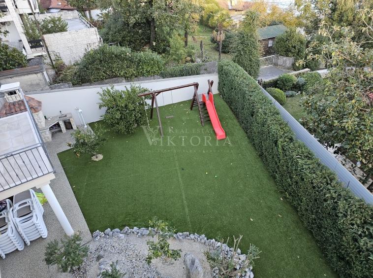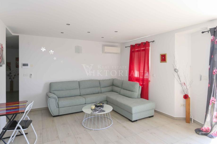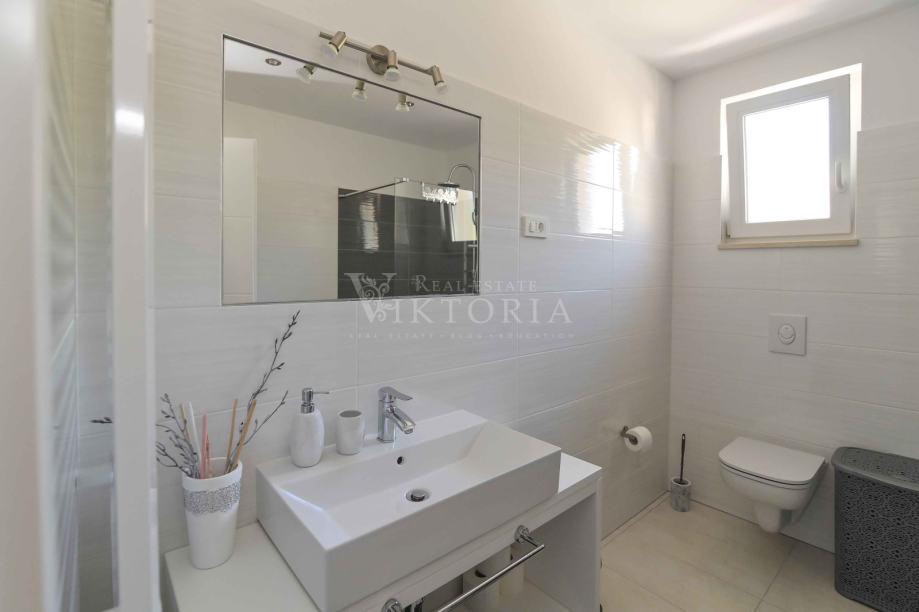 Vila je podijeljena na dva prostrana stana od 110 m² svaki, povezane unutarnjim stubištem, čime je osigurana privatnost i funkcionalnost za obitelj s više članova ili čak kao investicija za iznajmljivanje. Svaki stan ima tri spavaće sobe, tri kupaonice i vlastite balkonske terase koje pružaju uživanje u suncu i prekrasnom pogledu na more, dok su velike staklene površine osigurale obilje prirodne svjetlosti i besprijekoran osjećaj prostora.